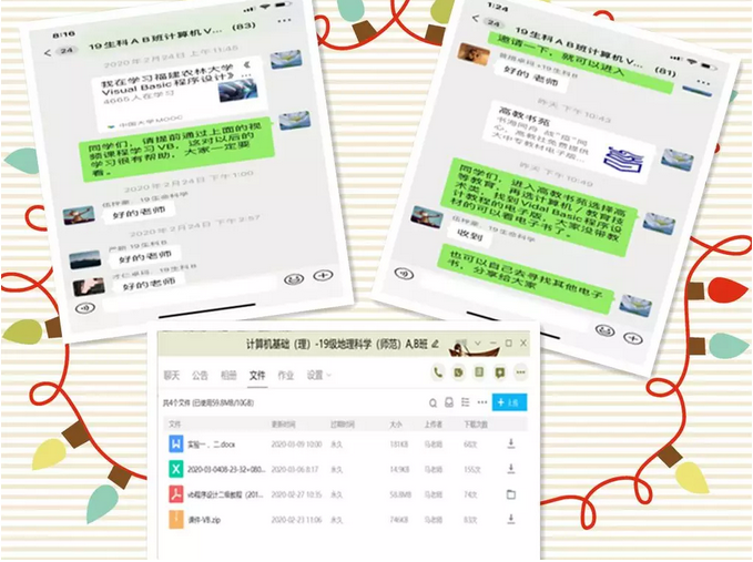 为顺利开展计算机公修教学的网上直播课程,学院在假期期间,组织承担《计算机基础(理)》这门课程的10名老师,及时建立计算机公修课程QQ群,在群里开展网络直播课程的教学模式讨论。并先后组织教师从网上下载与本课程相关的MOOC视频资源、电子版教材等;为了使网络直播课取得良好的教学效果,学院负责公修教学的老师积极组织任课教师修改课程教学PPT课件、实验指导书、习题集等教学资源,并在QQ群里共享。