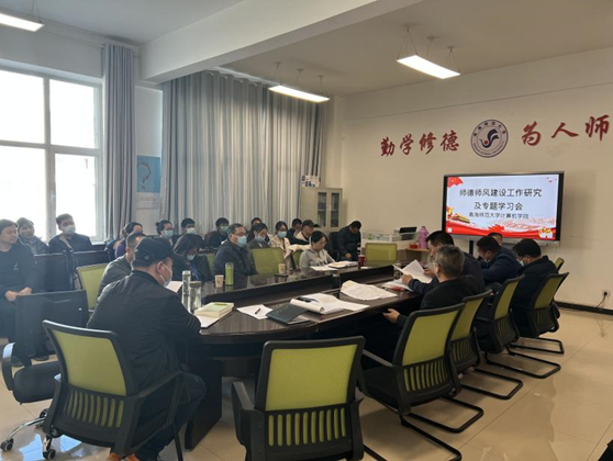 会上,黄鹤鸣分析研判了学院在师德师风方面存在的问题,对师德师风建设工作进行部署,并提出以下要求:一要健全师德师风建设长效机制,完善其制度体系,推动其建设常态化;二要以强化师德管理考核为手段,严格执行教师职业道德规范。黄鹤鸣强调,要通过全院教职工的共同努力和集中整改,努力建设一支师德高尚、业务精良的教师队伍,以优良的师风带动教风、促进学风,引导学院教师以德立身、以德立学、以德施教、以德育德。