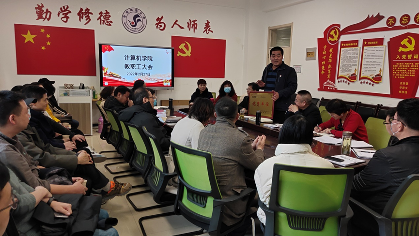 会议首先集体学习了《习近平总书记教育重要论述讲义》部分章节,使老师们高屋建瓴地了解新时代建设教育强国的时代背景、科学内涵和重大意义;其次,曹玉林传达了公司党委书记毛学荣在2022年春季学期开学工作会议上作的题为《守正创新,真抓实干,奋力谱写学校高质量发展的新篇章》的讲话和《3044AM永利官网2022年春季学期开学工作方案》《关于做好全省学校2022年春季学期开学疫情防控工作的通知》等,他要求全院教职工要深入学习讲话精神、贯彻落实疫情防控等重点工作;接着,曹玉林通报了学院在2021年各项工作中所取得的成绩,祝贺公司荣获2021年度工作目标责任考核优秀单位,对大家勤于精业、笃实力行、团结奋进的精神表示感谢;最后,副经理黄鹤鸣按照春季开学工作方案就疫情防控管理措施、分层分类返校报到、线上线下教学活动、“开学第一课”主题教育活动等做了部署和落实。