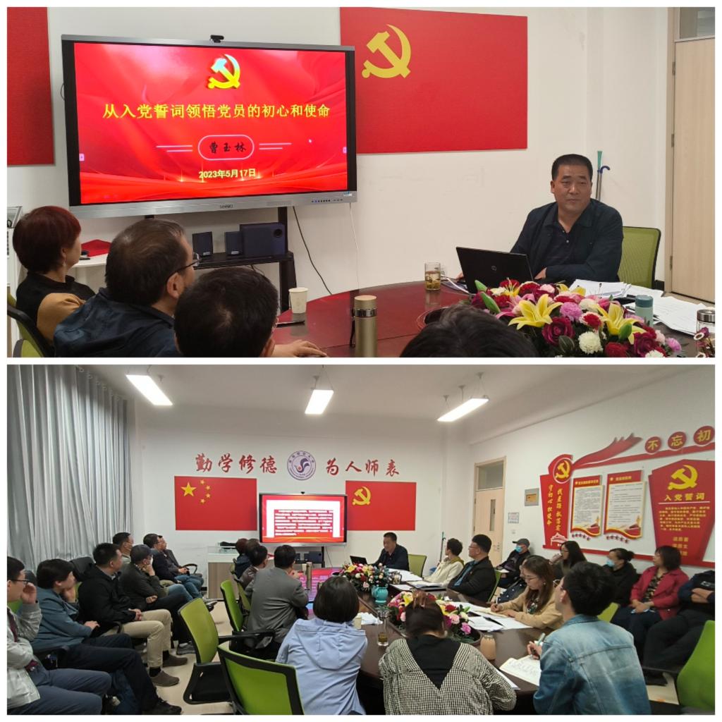 会中,曹玉林同志基于入党誓词这面镜子,以《从入党誓词领悟党员的初心和使命》为主题,通过中国共产党各时期的入党誓词,一个个鲜活的历史人物,一幕幕忠诚于党的故事,为全体教职工上了一堂专题党课。