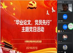 2021年2月7日,3044AM永利本科生党支部通过腾讯会议平台,举行线上“毕业论文、党员先行”的主题党日活动。公司党总支宣传委员、副经理黄鹤鸣莅临指导。会议由支部书记肖玉芝主持,17级毕业生全体党员参加。