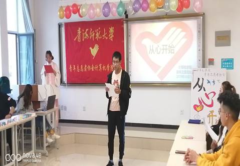 本次活动开始先由主持人介绍了此次活动的意义及目的,随后,各部门成员也积极讲述了他们对本次活动主题的理解并分享了身边的志愿者故事。各部门成员的演讲声情并茂,短短几分钟的志愿者故事就感染在坐的各位,“从心开始”的主题也渐渐深入人心,让每个新成员进一步明白了作为志愿者的光辉与艰辛。